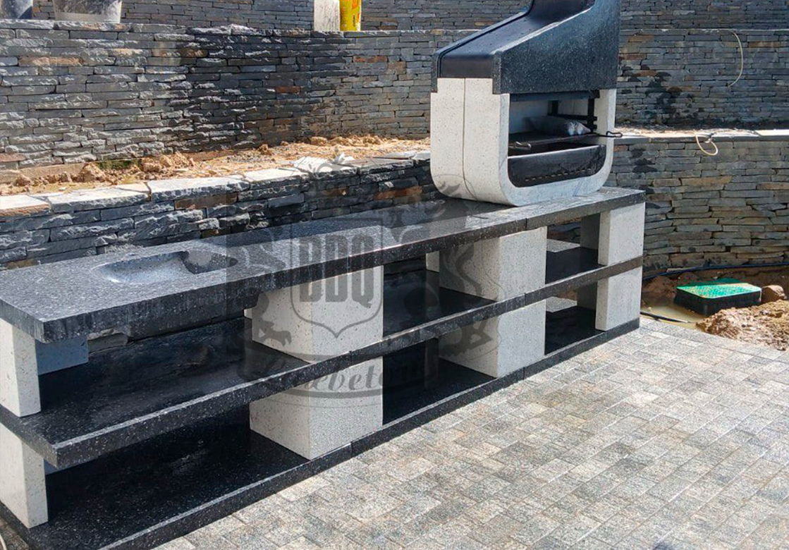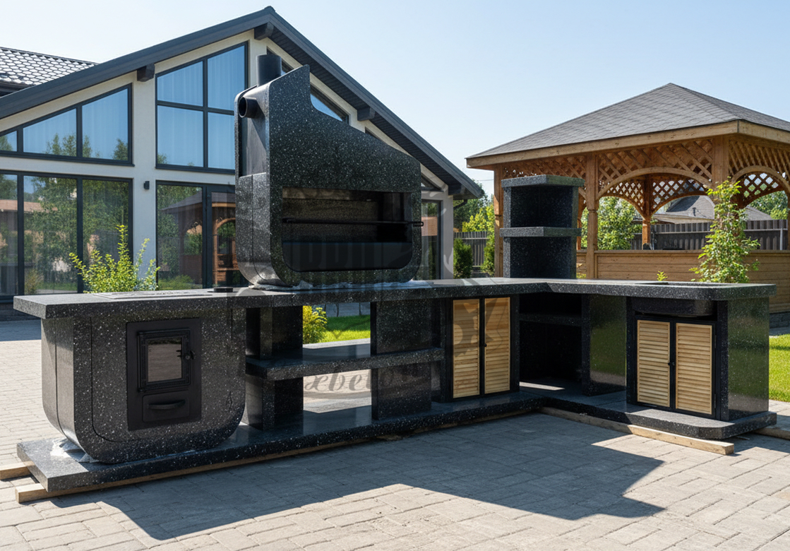 Дымосборник из металла 2 мм с жаропрочной краской, столешница не впитывает загрязнения и жир. Возможна установка дополнительных модулей: коптильня, тандыр, гриль для шампуров. Вес модулей 70–100 кг обеспечивает устойчивость. Монтаж проводится на ровную площадку — достаточно двух человек и пары часов времени.